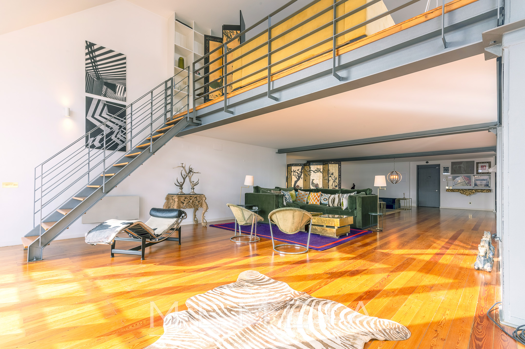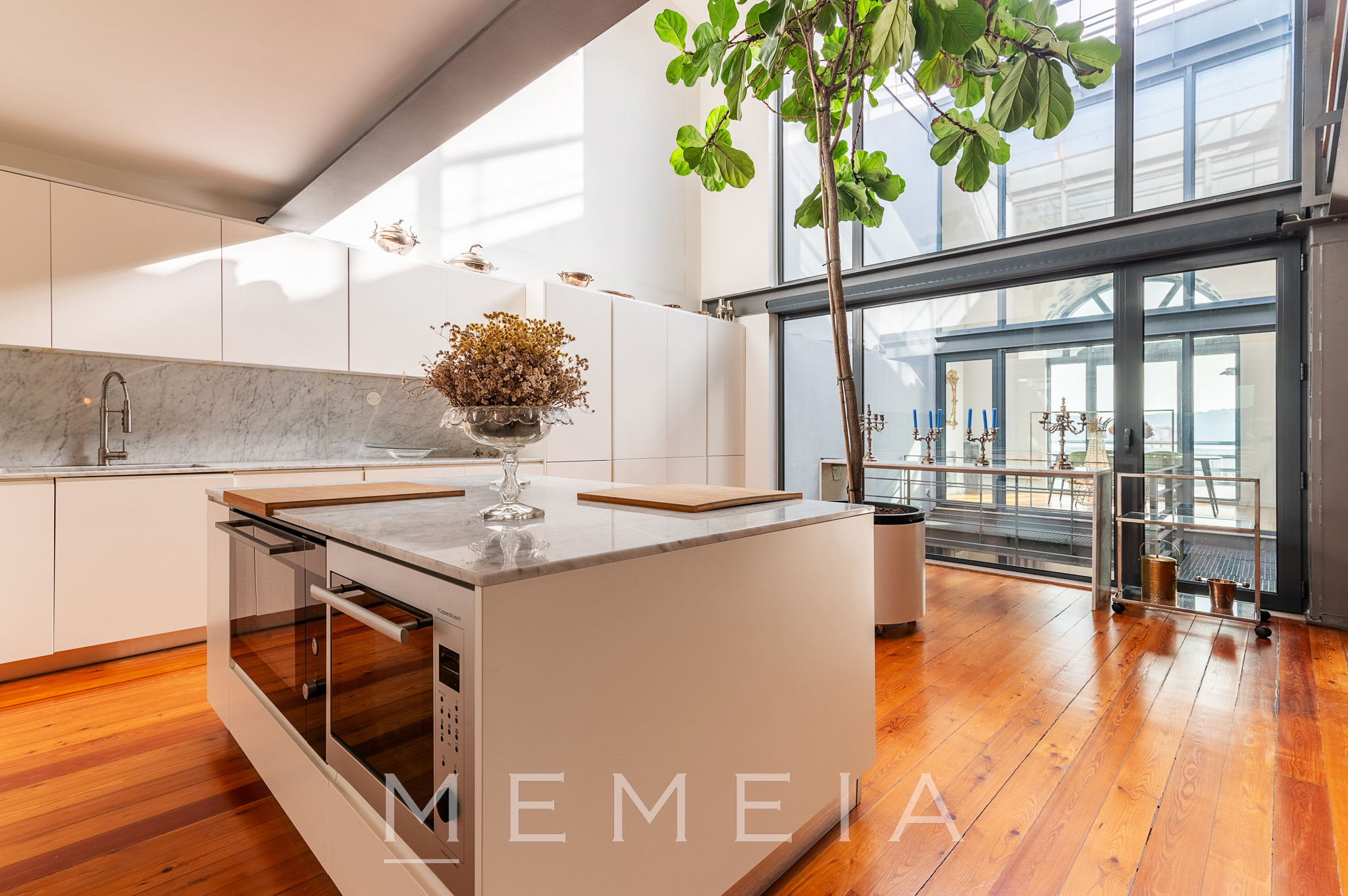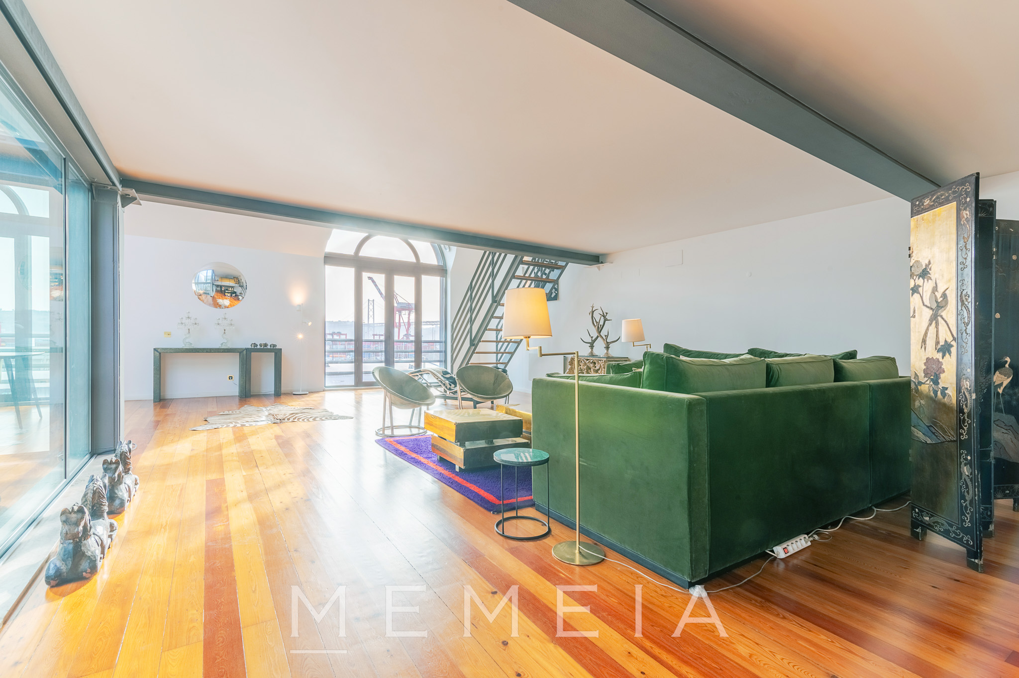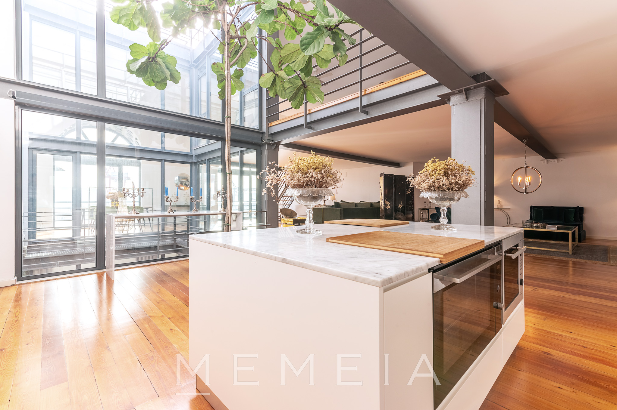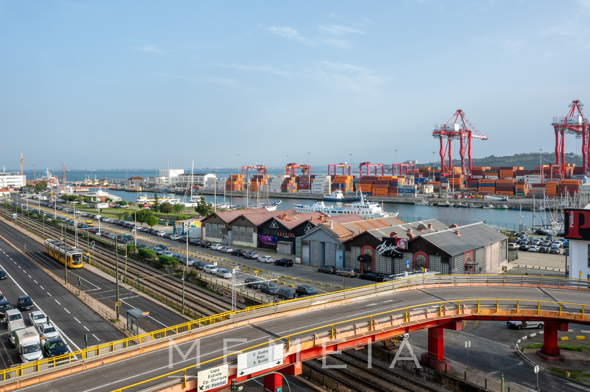 Loft inserido num antigo edifício industrial na Avenida 24 de Julho, projetado por Gustave Eiffel e convertido em condomínio de luxo em 2004. Com vista panorâmica sobre o Tejo, o espaço inclui dois lugares de estacionamento, arrecadação e potencial para transformar-se em dois quartos. A luz atravessa o saguão envidraçado, iluminando toda a área social. A fachada preserva os azulejos Arte Nova das cerâmicas Viúva Lamego, mantendo o caráter original da década de 1920.